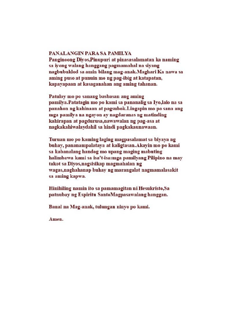 PANALANGIN PARA SA PAMILYA Panginoong DiyosPinupuri at pinasasalamatan ka naming sa iyong walang hanggang pagmamahal na siyang nagbubuklod sa amin bilang mag-anakMaghari Ka nawa sa aming puso at punuin mo ng pag-ibig at katapatan. Basahin ang Mateo 69 10. 34 Ang Handog kong Pag-aayuno Fasting kay Hesus 34.