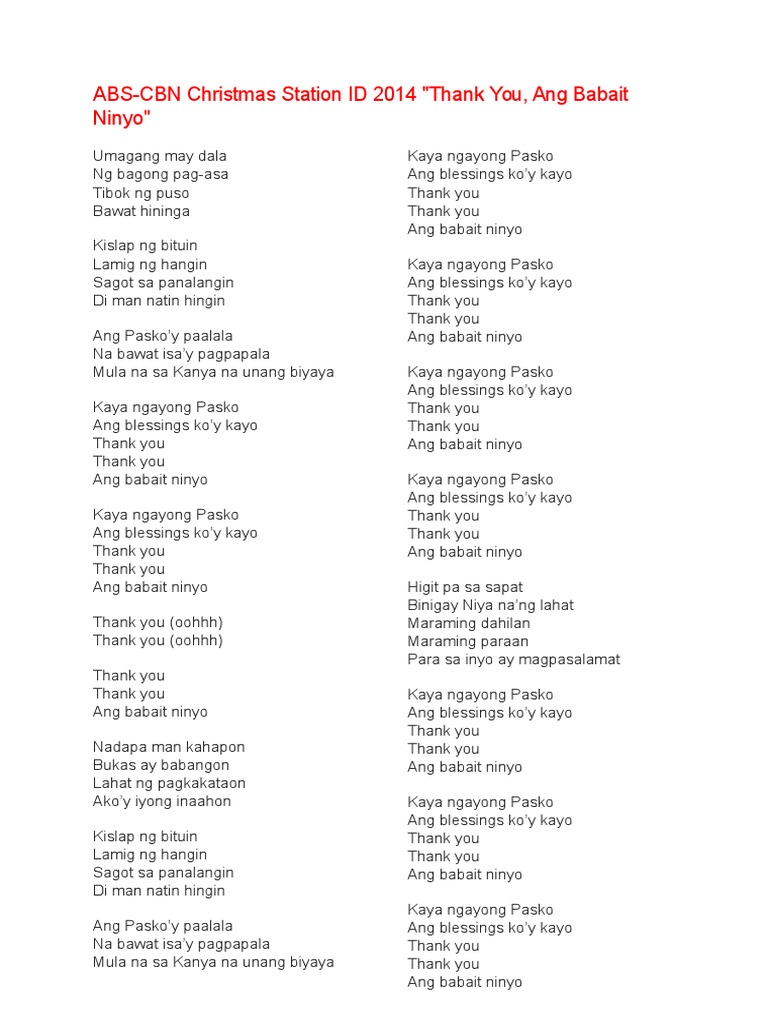 Lets laugh and cry and dream together. Lea Salonga Sarah Geronimo Bamboo Sharon Cuneta Joshua Oliveros Lyca Gairanod Elha Nympha Antonnethe Tismo. Isang Pamilya Tayo Ngayong Pasko ImageYoutube Lyrics for song ABS-CBN Christmas Station ID 2016 Bawat daang binabaybay Pagmamahal umaalalay Kabiguan man o tagumpay Hawak mo ang aking kamay Hindi tayo maliligaw Walang bibitaw Pag-ibig ang mangingibabaw Pag-asa ay abot-tanaw Naniniwala pa rin ako Sa himala ng pasko Na magkakaisa.
