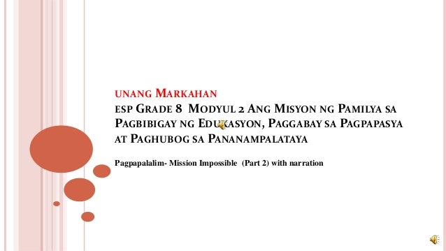 YumangMga misyon ng pamilya-Pagbibigay ng Edukasyon-Pagbibigay sa mabuting pagpapasya-Paghubog ng pananampalataya. 20201019 View ppt-esp-week-3pptx from HUM 220 at San Francisco State University. 20210302 View ESP-8-Week-3-4pdf from NSCI NSTP1 at Polytechnic University of the Philippines.