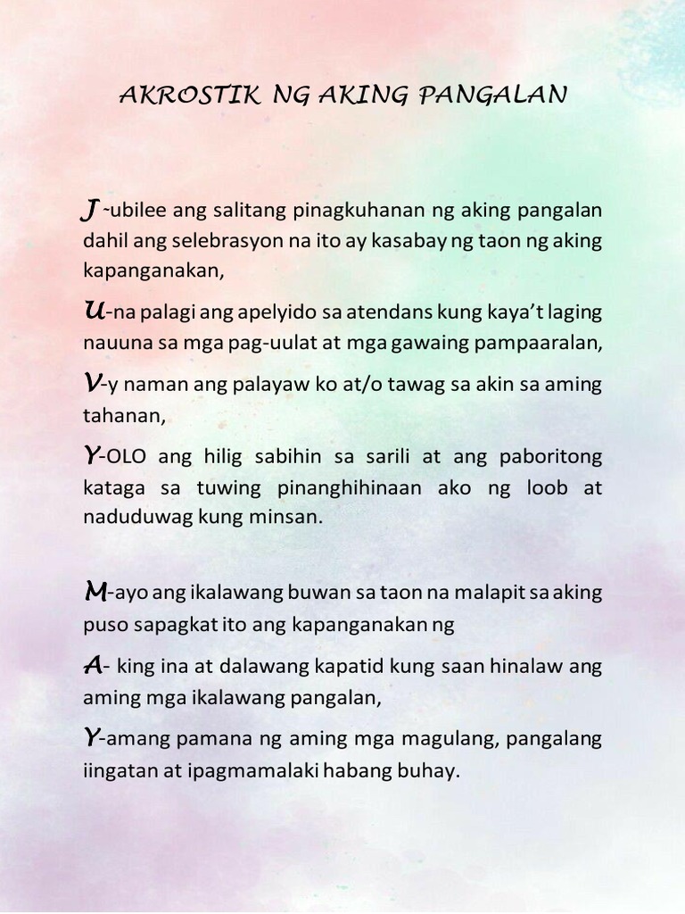 AKROSTIK TUNGKOL SA PAMILYA Ang mga Akrostik ay isang tula o iba pang kasulatan o kasabihan na kung saan ang unang titik ng bawat linya ay mayroong mensahe. Antolohiya Ng Mga Tulang Akrostik. Heto ang mga halimbawa para sa salitang.